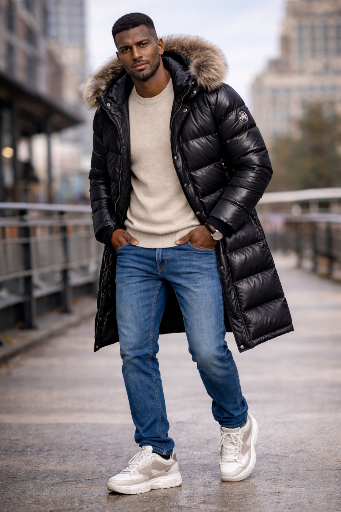Kombinin merkezinde yer alan uzun, parlak dokulu şişme mont, soğuk havalarda maksimum koruma sağlarken aynı zamanda iddialı bir siluet yaratıyor. Parlak yüzeyi ışığı zarif bir şekilde yansıtarak lüks bir etki oluşturuyor. Uzun kesimi, vücut oranlarını dengeliyor ve güçlü bir duruş kazandırıyor. Şehir modasında sıkça tercih edilen bu mont formu, fonksiyonelliği stilin önüne geçirmeden sunuyor.