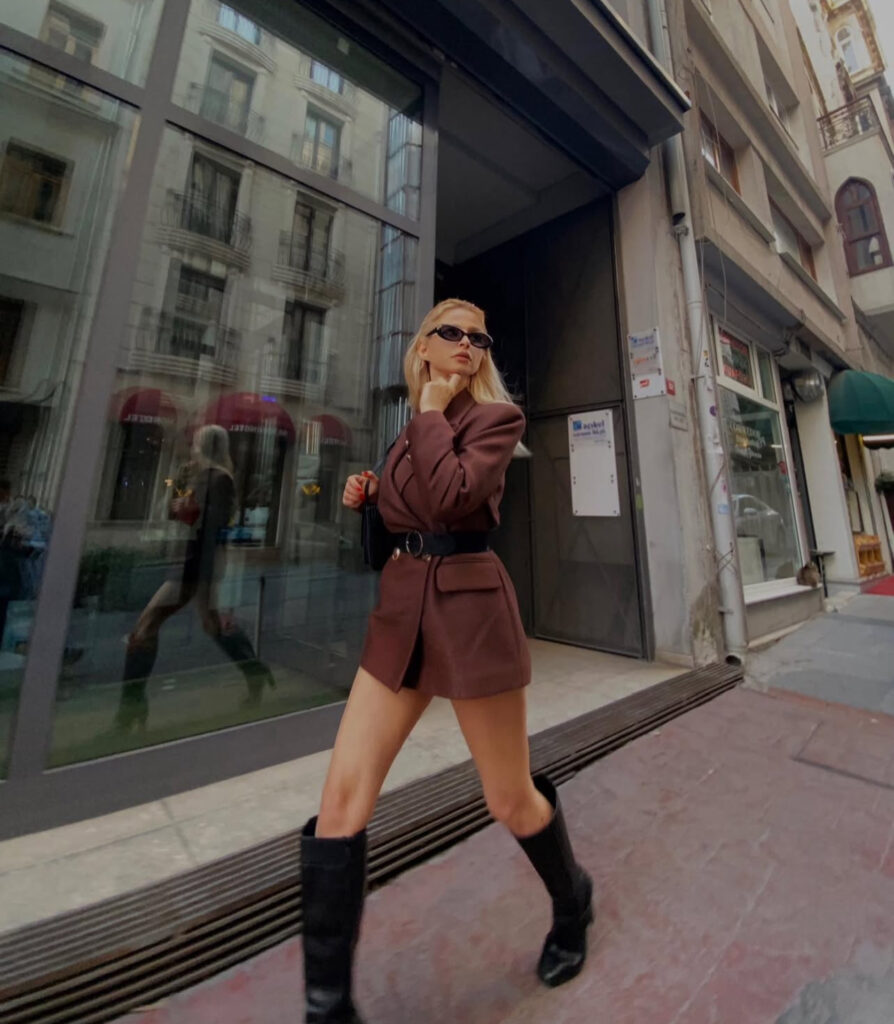 Pınar Yılmaz’ın bu kombini, trendlerden bağımsız ama çağın ruhuna uyumlu bir stil anlayışını yansıtıyor. Güçlü çizmeler, zamansız bir elbise, sade bir çanta ve karakterli bir gözlük… Hepsi bir araya geldiğinde, şehirli ve kendinden emin bir görünüm ortaya çıkıyor. Moda bazen sadece ne giydiğin değil, onu nasıl taşıdığındır.