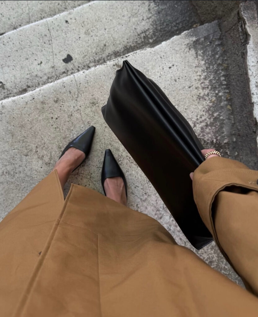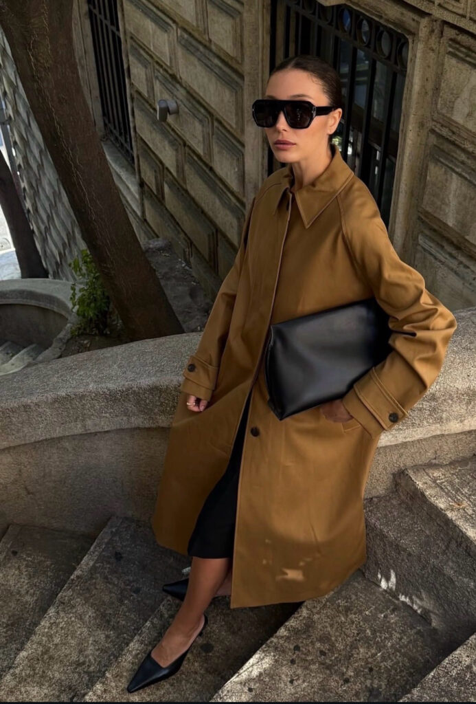 Sivri burunlu siyah topuklu ayakkabılar ise görünümün alt çizgisini belirliyor. Feminen duruşları, trençkotun maskülen havasıyla uyum içinde çalışarak silueti daha güçlü hâle getiriyor.